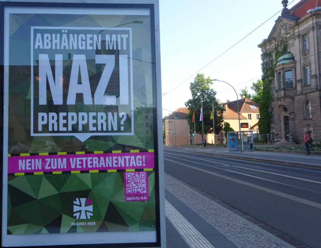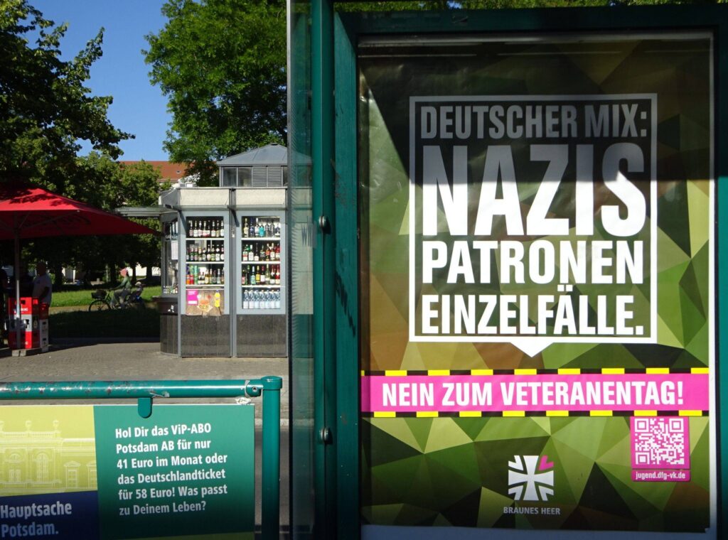 Den Bundis den Tag versauen! Gleich im ersten Jahr in dem der Veteranentag stattfindet machen Aktivist:innen sich daran Werbevitrinen in Potsdam zu kapern und eigene Plakate darin aufzuhängen. Auf den Postern, ganz im Tarnfleck Muster der Bundeswehr gehalten, ist entweder “Mit Nazipreppern abhängen?” oder “Nazis, Patronen, Einzelfälle?” zu lesen.