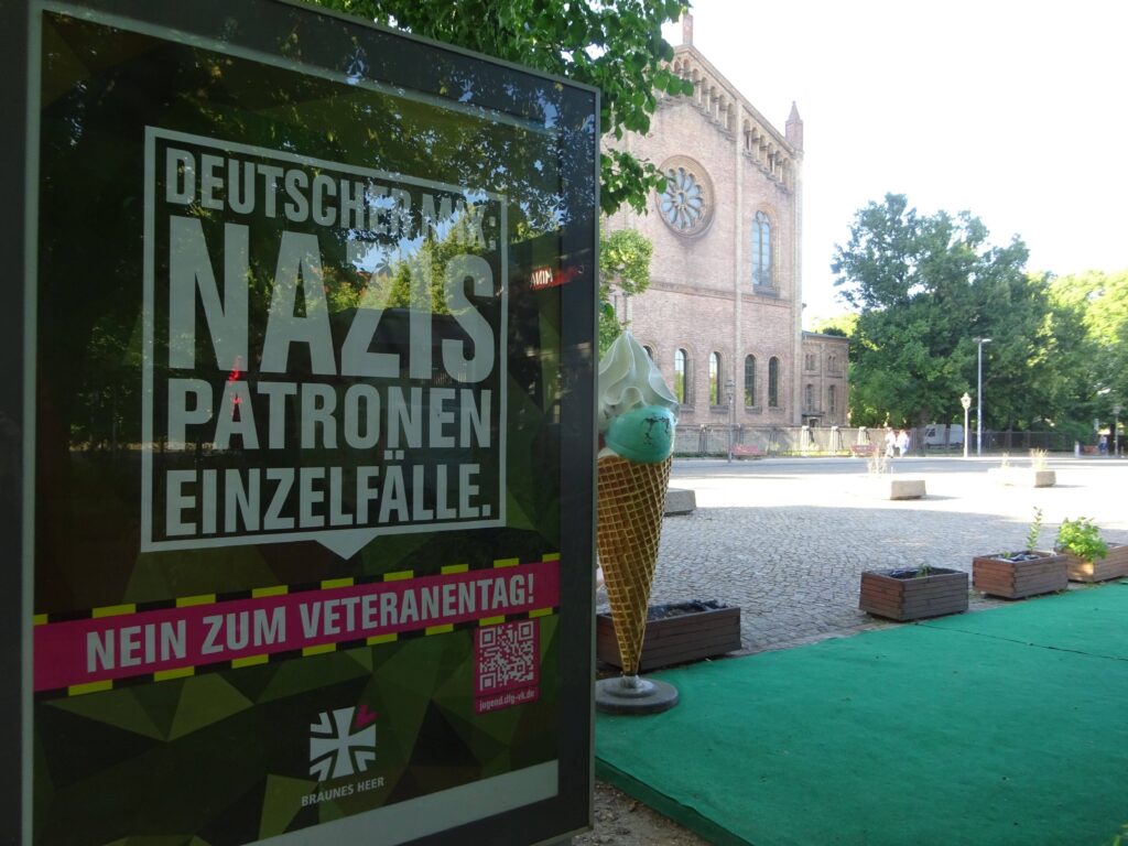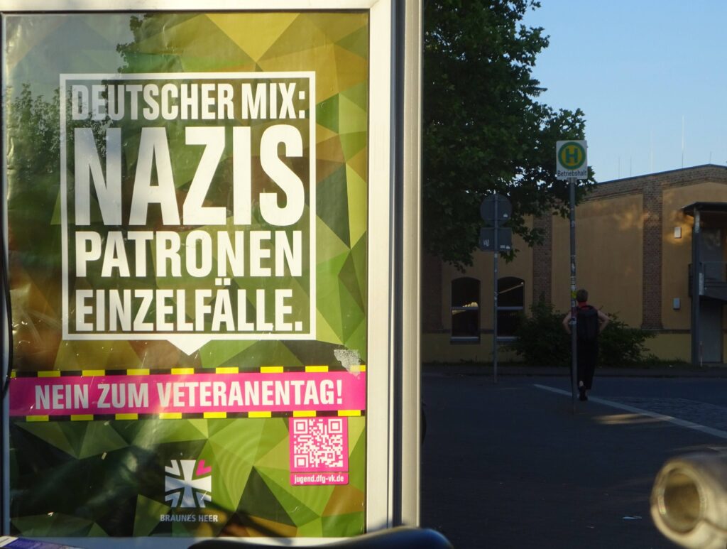 Auf einem der Poster steht: Deutscher Mix: Nazis, Patronen, Einzelfälle . Darunter ein pinker Störer mit „Nein zum Veteranentag“ sowie ein qr code, der zur Webseite des Jugend Verbands der DFG-VK führt. Die Reihe von rechtsextremistischen Skandalen sind für die Bundeswehr <a href="http://nur Einzelfälle. Im Jahr 2020 meldete Der Militärische Abschirmdienst (MAD) 477 neue rechtsextreme Verdachtsfälle. Rechtsextremismus, das Horten von Sprengsoff, Munition und konkrete Anschlagsplanung, sowas fällt in der Bundeswehr mitunter gar nicht auf. “Nicht zu fassen“ ärgert sich Kai “Gerade das rechtsextreme Äußerungen von “Kameraden” anscheinend nicht erkannt werden zeigt doch, das es ein größeres Problem gibt als nur ein paar wenige Einzelfälle”.