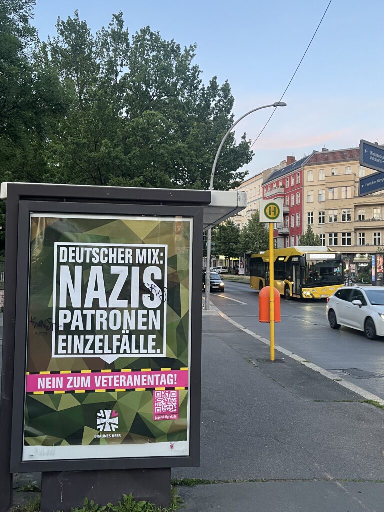 Am Sonntag ist Nationaler Veteranentag. Doch statt die Bundeswehr zu ehren, beschimpfen in der Berliner Innenstadt über 100 Werbeplakate die Soldatinnen als Nazi-Prepper. Aktivistinnen aus der Werkstatt für Antifaschistische Aktionen (w2a) und drei verbündete Gruppen kaperten am hellichten Tag am Samstag morgen über 100 Werbevitrinen im Berliner Nahverkehr. Den die Werbevitrinen lassen sich mit einfachen Rohsteckschlüssel aus dem Baumarkt öffnen und die Berliner Staatsanwaltschaft findet das OK, „wenn nix gestohlen oder beschädigt wird“.