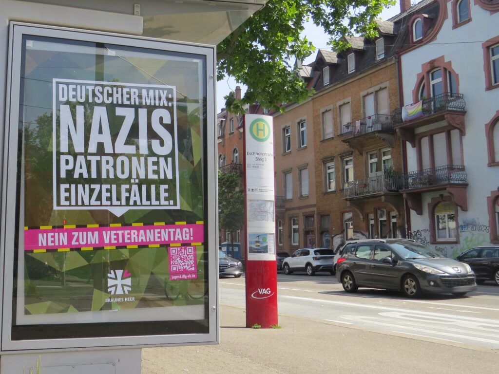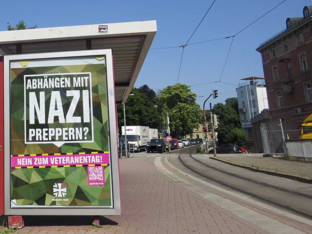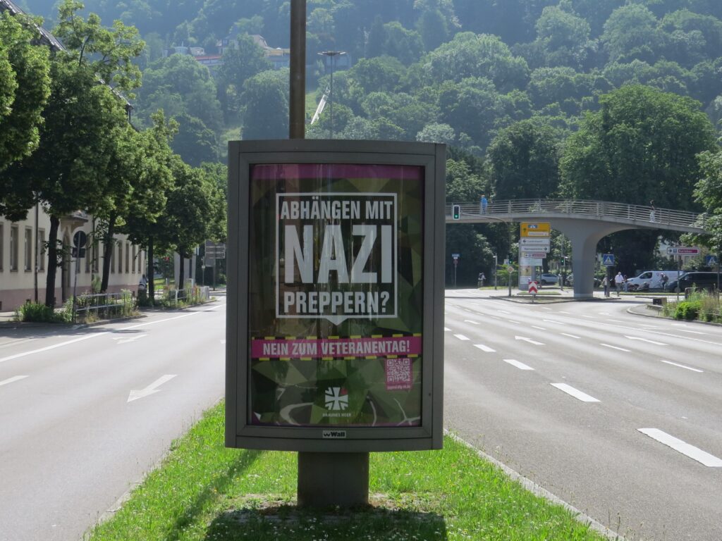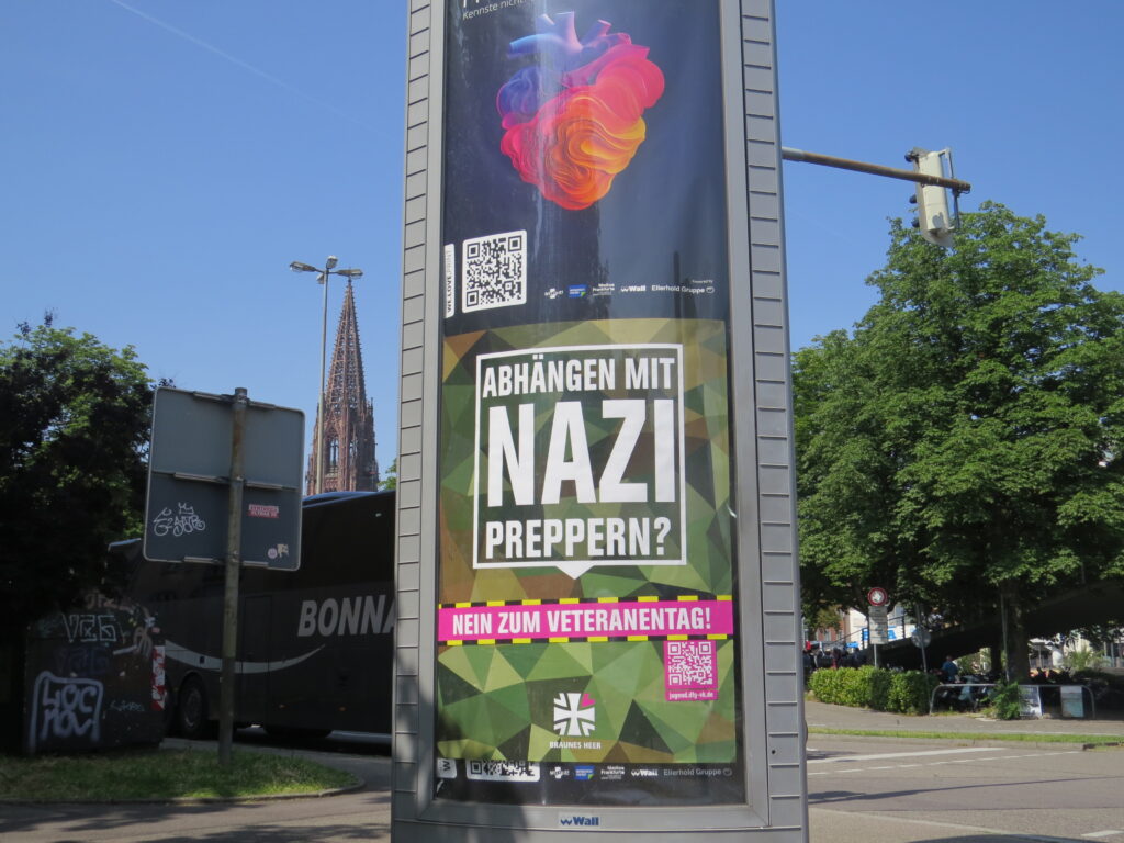 In Freiburg und ganz Deutschland kapern Aktivist*innen Werbevitrinen, um der Bundeswehr zu zeigen, was sie von ihr und dem Veteranentag halten. So klauen sie den Militärs die Deutungshoheit und zeigen auf, was am Sonntag wirklich abgeht: ein Nazipreppertag.