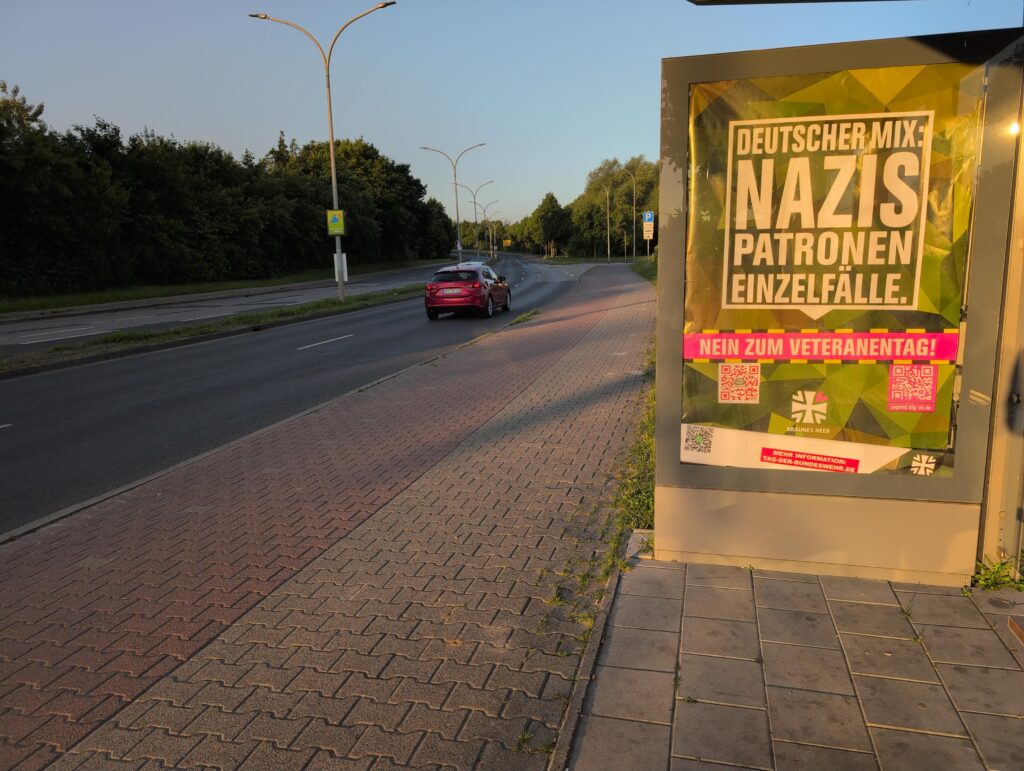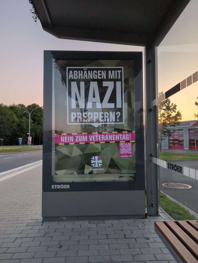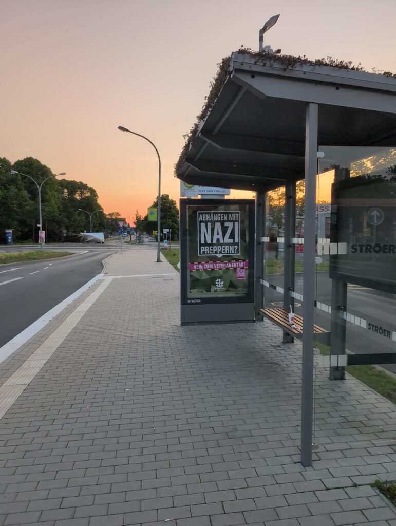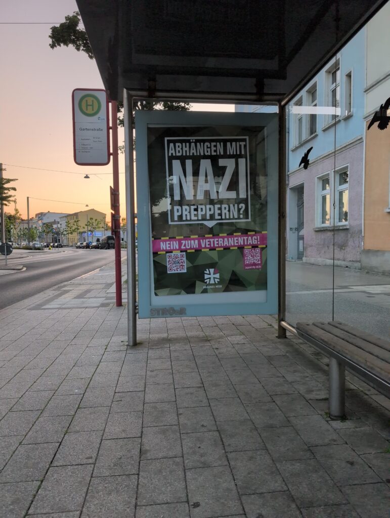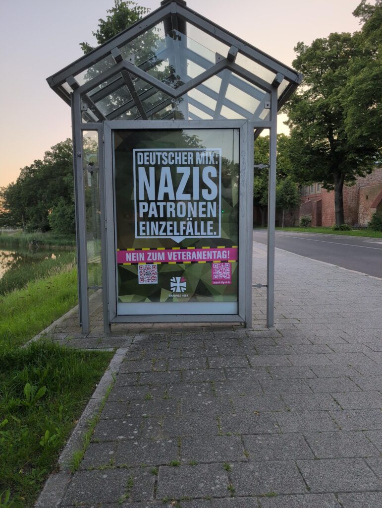 In Stralsund meldeten besorgte Bürger die Adbustings gegen den Veteranentag ans Ordnungsamt. Daraus folgen gleich mehrere Medienberichte. Vielen Dank dafür!