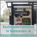 Weil durch die Bundeswehr nach wie vor ein brauner Geist weht. Den Lobbyismus für den Veteranentag haben der Reservistenverband und die Veteranenverbänden betrieben. Das sind gesellschaftliche Gruppen, die regelmäßig mit Nazikram, Waffen klauen, Terrorismus und Putschplänen auffielen. Gerade diese Leute werden mit dem Veteranentag besonders geehrt. Deswegen wollen wir mit bundesweiten Adbusting-Aktionen in den Innenstädten gegen den Veteranentag protestieren. Doch was genau ist das Problem mit den Veteranenverbänden?