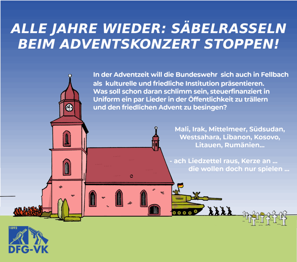 Auch wenn heute mehrere Kirchen nicht mehr mit dem Militär kooperieren, lies sich u.a. die Fellbacher Lutherkirche leider erneut für die militärische Weihnachtswerbetour einspannen. Das ganze ist natürlich eine reine Propagandaveranstaltung um für das Militär, für Aufrüstung und für Auslandseinsätze zu werben.