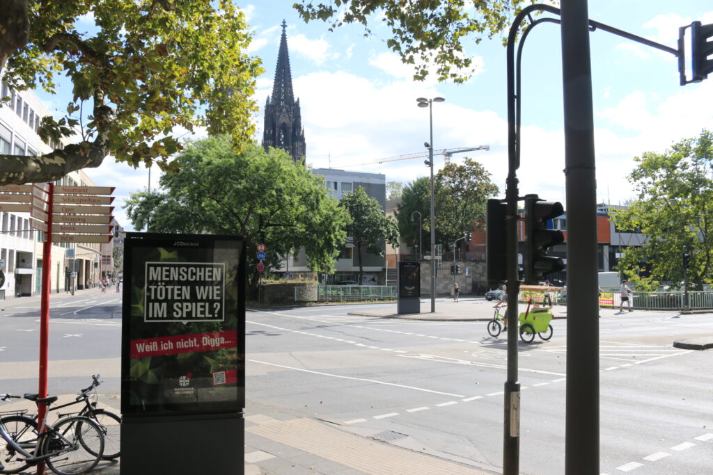 Da staunten viele Gamescom-Besucher:innen nicht schlecht, als sie auf dem Weg zur größten Spielemesse der Welt an gefälschten Bundeswehrplakaten vorbei liefen. Statt der üblichen Werbung sind auf den gefälschten Plakaten in Bundeswehr-Optik Sprüche wie „Befehl, Gehorsam, Schikane? – Weiß ich nicht Digga“ zu lesen. Antimilitaristinnen aus dem Jugendnetzwerk der Friedensgesellschaft-Vereinigte Kriegsgegner:innen haben die Adbustings rund um die Messe und in der Kölner Innenstadt platziert. Der Zeitpunkt der Aktion ist kein Zufall: Seit Jahren ist die Bundeswehr auf der Gamescom vertreten. „Mit der Aktion setzen wir ein Zeichen gegen die Vereinnahmung einer beliebten Videopielmesse und die Rekrutierung Minderjähriger“ erklärt Luca Schmidt, Sprecher*in des Jugendnetzwerkes der Friedensgesellschaft: „Zeitenwende, Kriegstüchtigkeit und ausufernde Debatten zur Wiedereinführung der Wehrpflicht? Wir fordern die Abschaffung der Bundeswehr und einen gesellschaftlichen Switch zu gewaltfreier Konfliktlösung und Sozialer Verteidigung.“