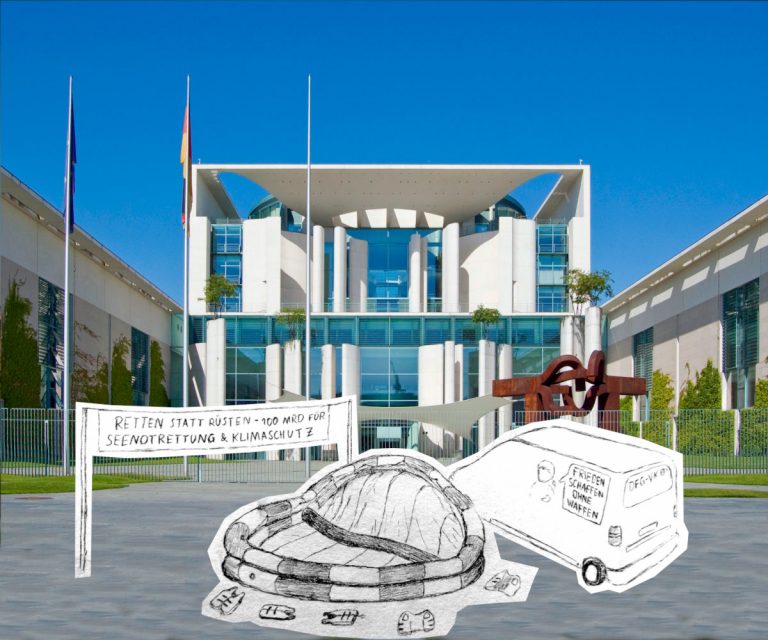Deshalb geht’s mit einer Rettungsinsel am 19. November (Samstag) vors Kanzler*innenamt. Wir fordern: „Retten statt Rüsten – 100 Mrd für Seenotrettung und Klimaschutz!“.