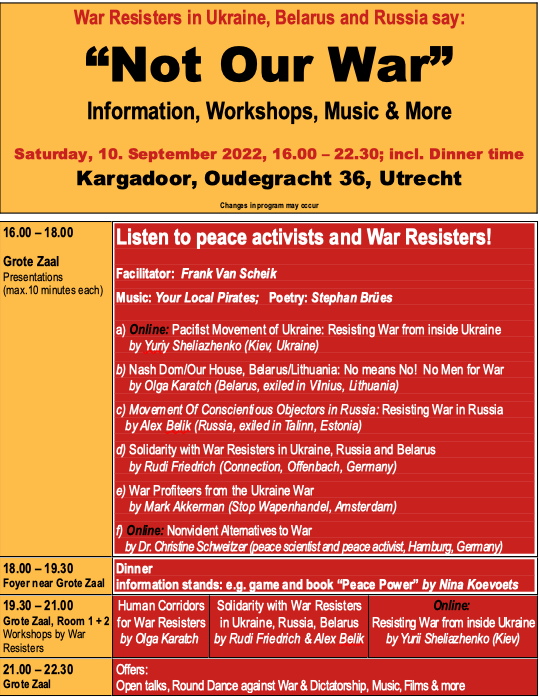Samstag, 10. September 2022: – Teilnahme am Programm „Not our war“ der War Resisters International Veranstaltungsort: Kargadoor, Oude Gracht 36, Utrecht, Niederlande – Gemeinsamen Abend verbringen mit Aktivisti anderer Organisationen