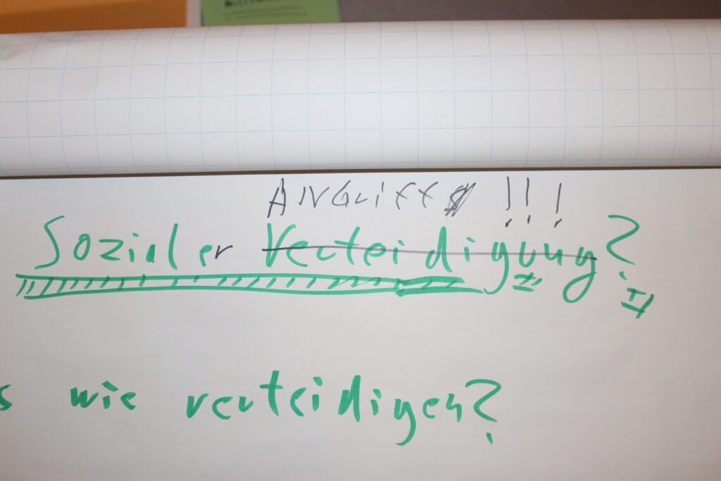 Sozialer Angriff? In einem Workshop haben wir das Konzept der sozialen Verteidigung kennengelernt. In der anschließenden Diskussion haben wir festgestellt, dass wir „Soziale Verteidigung“ gerne mit einer offensiven Komponente zu „Sozialem Widerstand“ erweitern würden. Darunter verstehen wir die praktische Anwendung von Sozialer Verteidigung um gesellschaftliche Veränderung herbeizuführen oder, im Falle eines Angriffs, vorzubeugen.